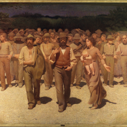 Per chi visiterà la mostra, un suggerimento: giunti alla grande sala finale, dove è esposto Il Quarto Stato, avvicinatevi all’opera per coglierne la trama composta con tecnica divisionista da colori non più chiari e luminosi, ma verdastri e bluastri, con tonalità “sulfuree” secondo la definizione di Pellizza, per aumentare il senso di forza e movimento della scena. Poi cambiate prospettiva, spaziale e mentale, andate a sedervi in fondo alla sala e fatevi trasportare nell’atmosfera di quel momento, di quella piazza e di quell’epoca, per cogliere il potente messaggio storico e sociale che l’opera trasmette. Una folla di personaggi che avanzano, verso il futuro, non aggressivi ma compatti e determinati, come scrisse Pellizza “con la tenacia dei loro ideali”.