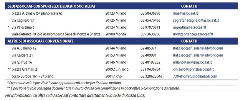 ALDAI mette a disposizione degli iscritti la propria sede di via Larga 31 per l’elaborazione del modello 730. L'agenda degli appuntamenti è curata dalla sede centrale Assocaaf di piazza Diaz 6 esclusivamente al numero 02 58436896.
