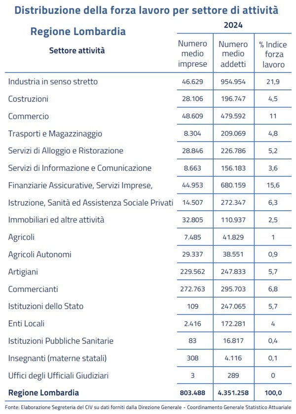 Nel triennio 2021-2023, si osserva in Lombardia un aumento del PIL ai prezzi di mercato, in linea con le altre regioni. Nel 2024 si riscontra un saldo netto occupazionale positivo, dovuto a un numero maggiore di assunzioni rispetto alle cessazioni dei rapporti di lavoro. Mentre per i lavoratori italiani, rispetto all’anno precedente, si assiste, a una riduzione delle assunzioni, sia a tempo indeterminato che determinato, per quelli stranieri si registra un incremento per entrambe. I settori con maggiori assunzioni riguardano: commercio, trasporti e magazzinaggio, servizi di alloggio e ristorazione, quelli relativi ad attività professionali, scientifiche e tecniche. I settori economici in cui i dipendenti privati presentano un reddito medio giornaliero più elevato sono quelli inerenti alle attività finanziarie e assicurative e all'estrazione di minerali da cave e miniere. In Lombardia, si assiste a un aumento del tasso di occupazione e un calo del tasso di disoccupazione, mentre aumenta leggermente il tasso di inattività. I lavoratori dipendenti con contratti part-time rappresentano il 21,4% del totale, di ben sei punti percentuali al di sotto del valore nazionale. Il 10,1 % dei cittadini lombardi fra i 15 e 29 anni è non occupato e non in istruzione (NEET).