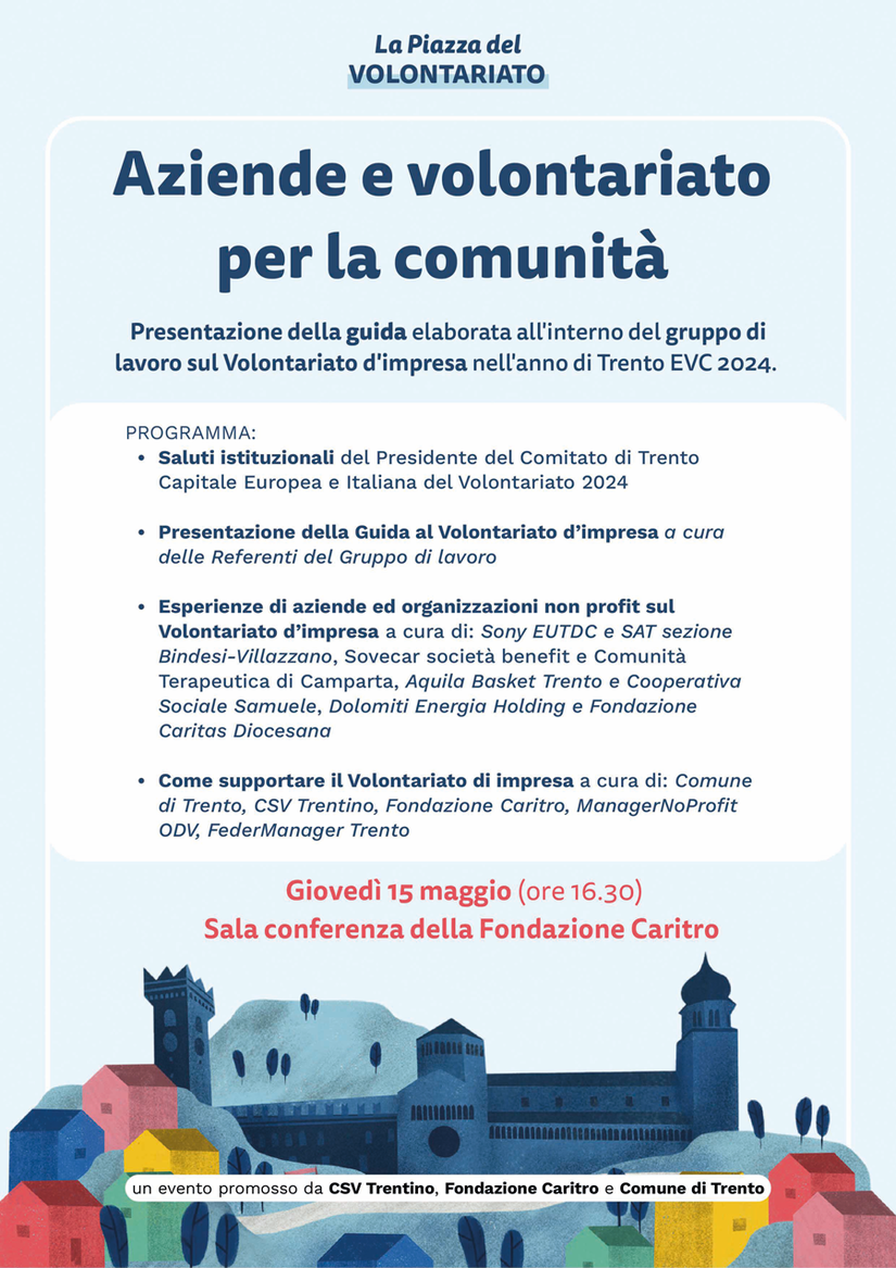 Nella sala conferenze della Fondazione Cassa di Risparmio di Trento e Rovereto si sono ritrovati volontari, imprese e associazioni di sostegno, come CSV, ManagerNoProfit e Federmanager Trento per la presentazione della Guida sul Volontariato d’impresa dal titolo “Aziende e volontariato per la comunità - guida al Volontariato d’impresa” alla definizione della quale ha contribuito la nostra associazione.