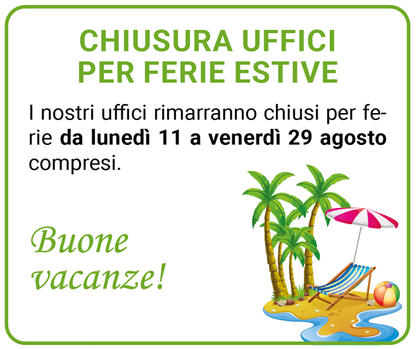 I nostri uffici rimarranno chiusi per ferie da lunedì 11 a venerdì 29 agosto compresi.