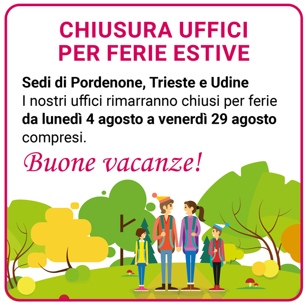 I nostri uffici rimarranno chiusi per ferie da lunedì 4 agosto a venerdì 29 agosto compresi.