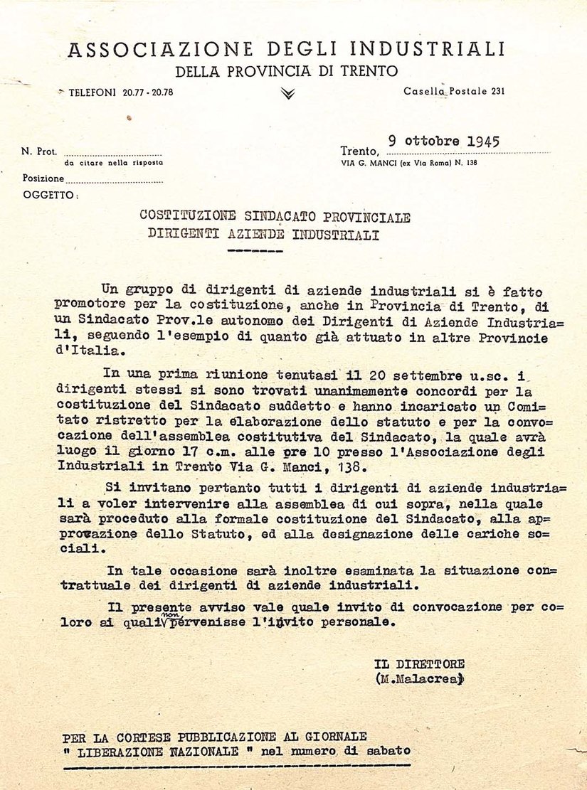 Il 9 ottobre 1945 l’Associazione degli Industriali avvisa tutti gli associati con questo comunicato che avrà luogo una Assemblea Costitutiva del Sindacato dei Dirigenti di Aziende industriali della Provincia di Trento.