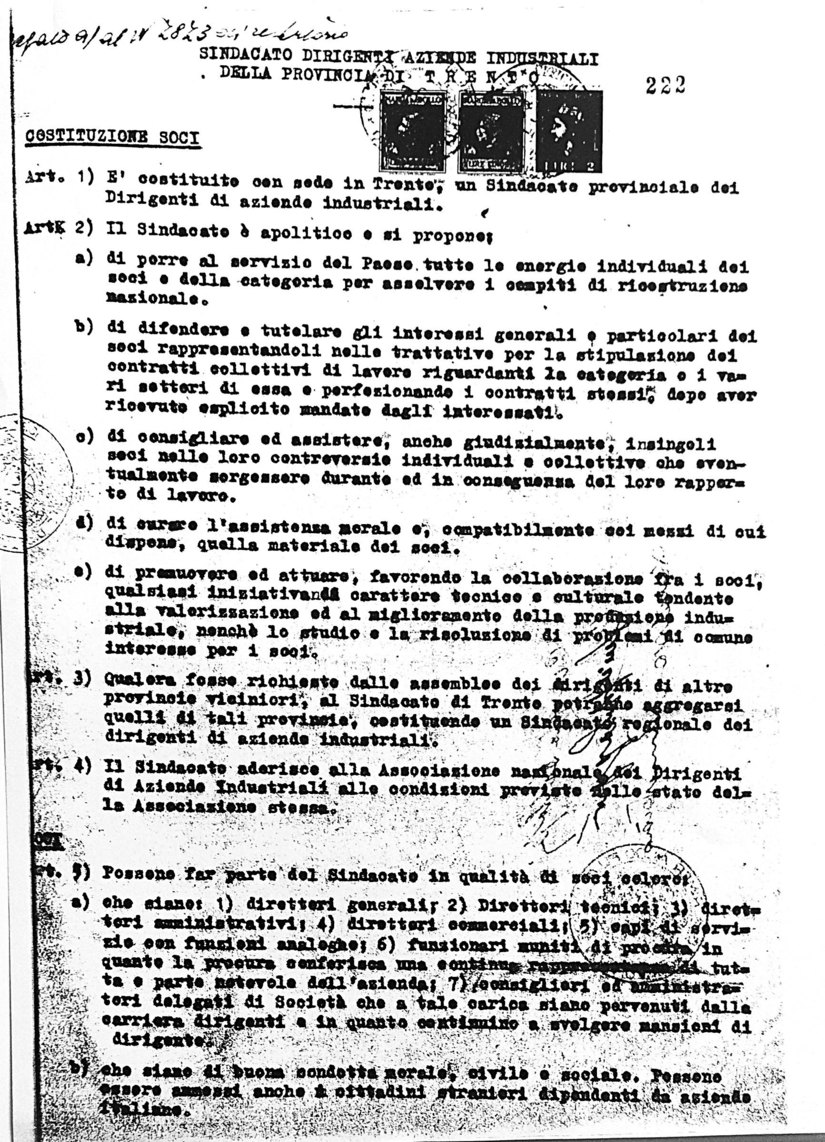 E così il 17 ottobre 1945 ha luogo l’Assemblea Costitutiva del Sindacato dei Dirigenti di Aziende industriali della Provincia di Trento, presso via Manci 138, sede dell’Associazione degli Industriali. Alle ore 10.00 alla presenza di 24 partecipanti il notaio dott. Aldo Rimer inizia la redazione dell’Atto Costitutivo.