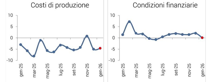 - Il saldo relativo ai costi di produzione nel mese corrente conferma il netto peggioramento avuto a dicembre (-4,6% da -5,0%).