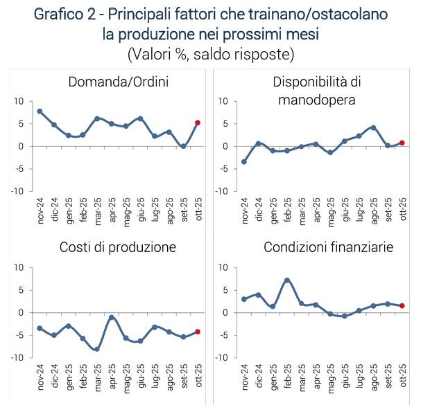 A ottobre, il sentiment degli industriali rimane favorevole ma in lieve flessione: quasi la metà delle grandi imprese vede la produzione in crescita, più di un terzo la indica stabile e il resto segnala un calo. Domanda e ordini sono i fattori di traino nei prossimi mesi