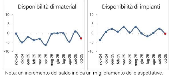 - Per quanto riguarda la disponibilità di materiali, il saldo delle risposte di ottobre scende in maniera significativa e va in territorio negativo (-2,9% da 0,8%).
