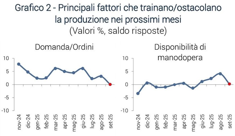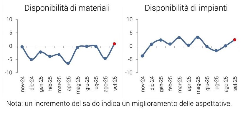 - Il giudizio degli industriali sulla disponibilità degli impianti migliora sensibilmente nella rilevazione di settembre (2,4% da 0,1%).