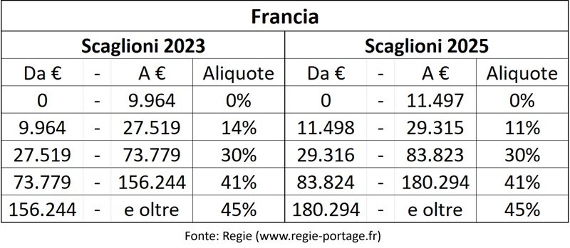- Confermato in Francia il metodo di calcolo della tassazione per scaglioni considerando il 90% del reddito ed escludendo i primi 11.497 euro, mentre in Italia si considera il 100% del reddito compresi i primi 8.500 euro.